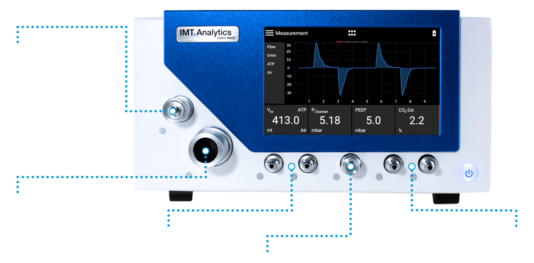 Das macht es zu Ihrem perfekten Partner, insbesondere für die Prüfung von Niederdurchfluss-Anästhesiegeräten, Seitenstrom-Capnometer, pneumatischen Ventilen, Spülströmen, Sauerstoffdurchflussmessern und mehr. Es bietet viele Parameter zur Prüfung von Atemgeräten, einschließlich hochfrequenter Oszillationsschlagraten von bis zu 33,33 Hz.