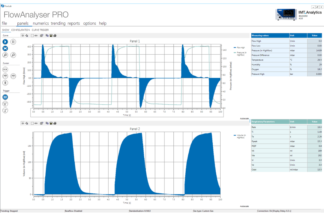 FlowLab, unsere optionale Software für Ihren PC, bietet Echtzeitkurven und überwacht die Fluss-, Druck- und Volumenparameter. Sie ermöglicht es Ihnen, automatisierte Testsequenzen zu erstellen, was die Effizienz Ihrer Geräte erhöht und Zeit während der Tests spart.