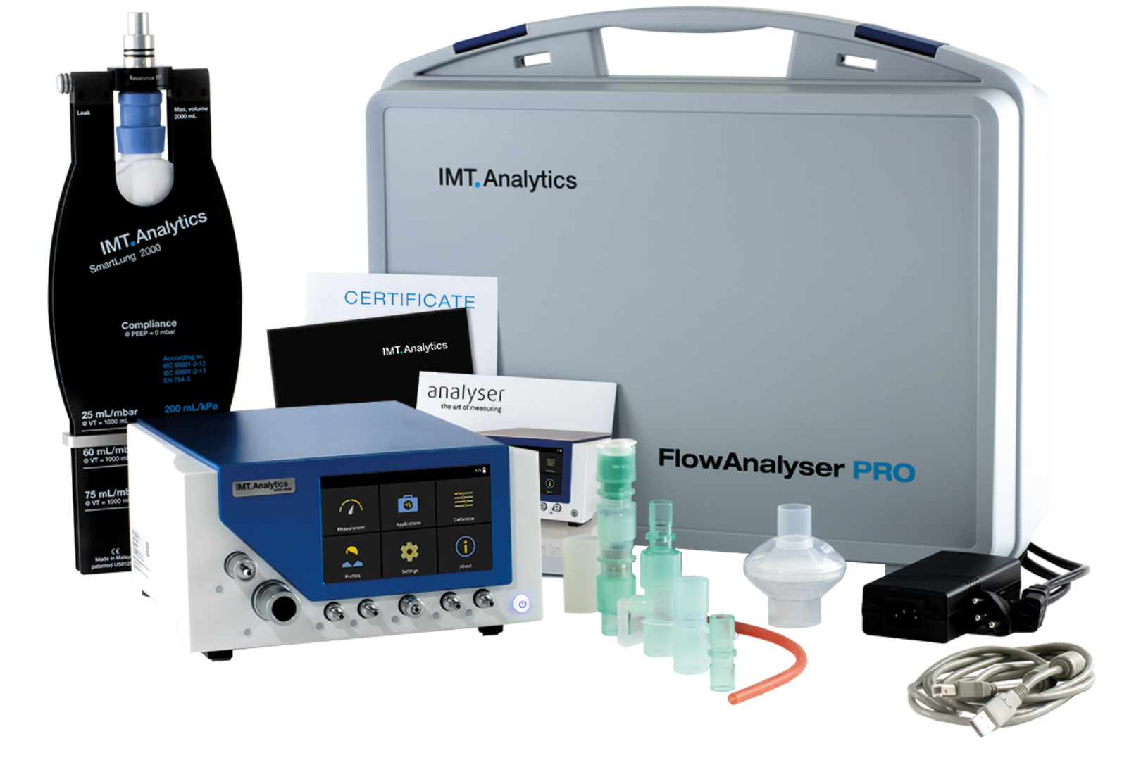 Die FlowAnalyser PRO Testsets werden mit umfassendem Zubehör geliefert, das für die Kalibrierung und Überprüfung von mechanischen Beatmungsgeräten und Anästhesiemaschinen geeignet ist.