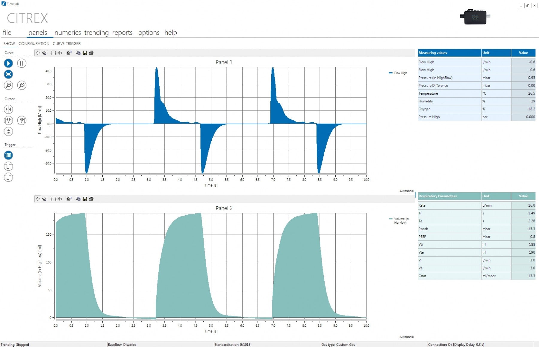 在您的PC上轻松监控和保存通风参数,包括流量、压力和体积测量。FlowLab以图形方式显示您的测量值,可以是数字形式或实时曲线。生成的趋势报告包含多达100小时的数据,以检查设备的长期功能。通过创建您自己的个性化测试报告,简化通风设备的验证过程,这些报告可以电子存储或打印。